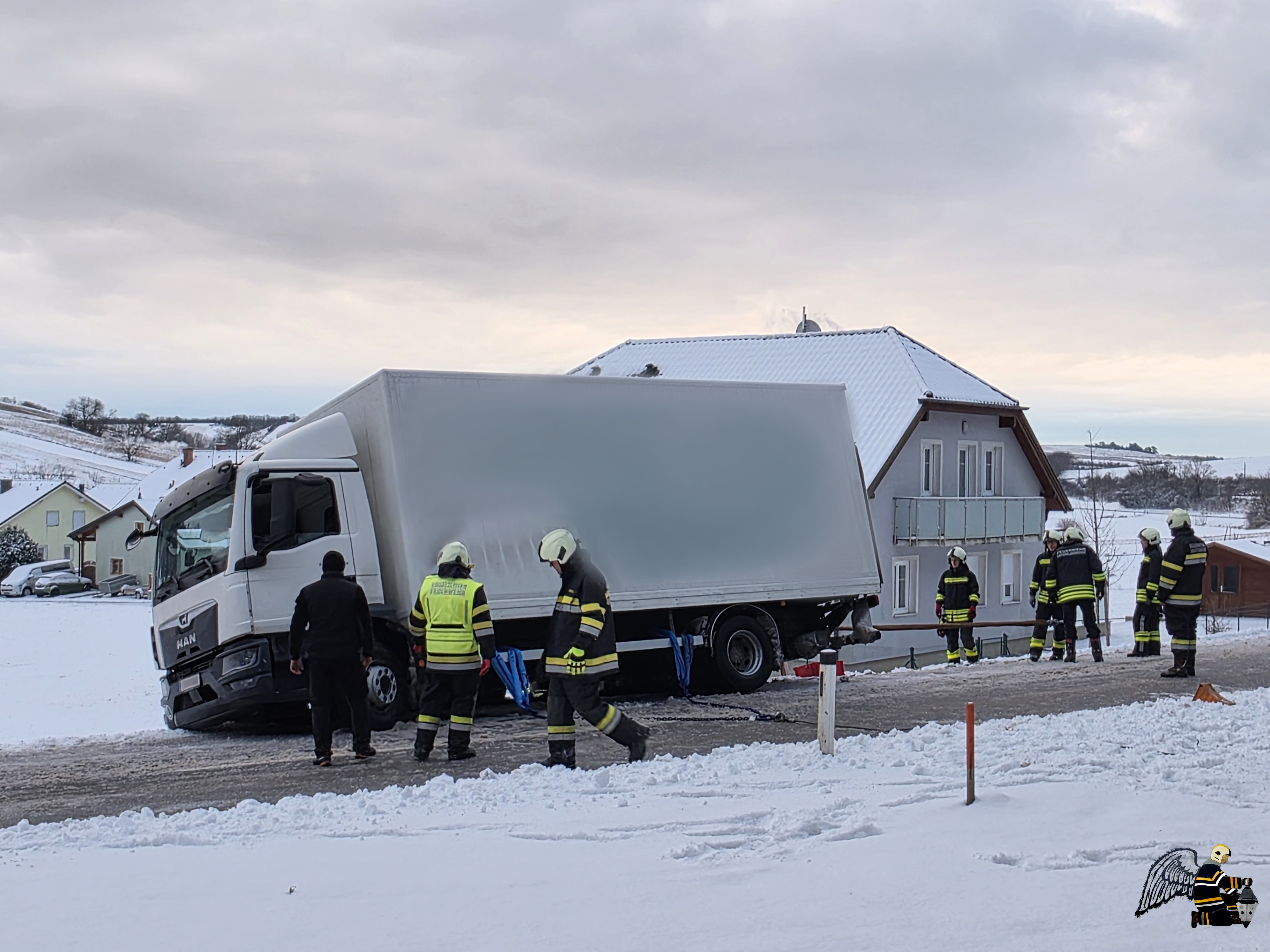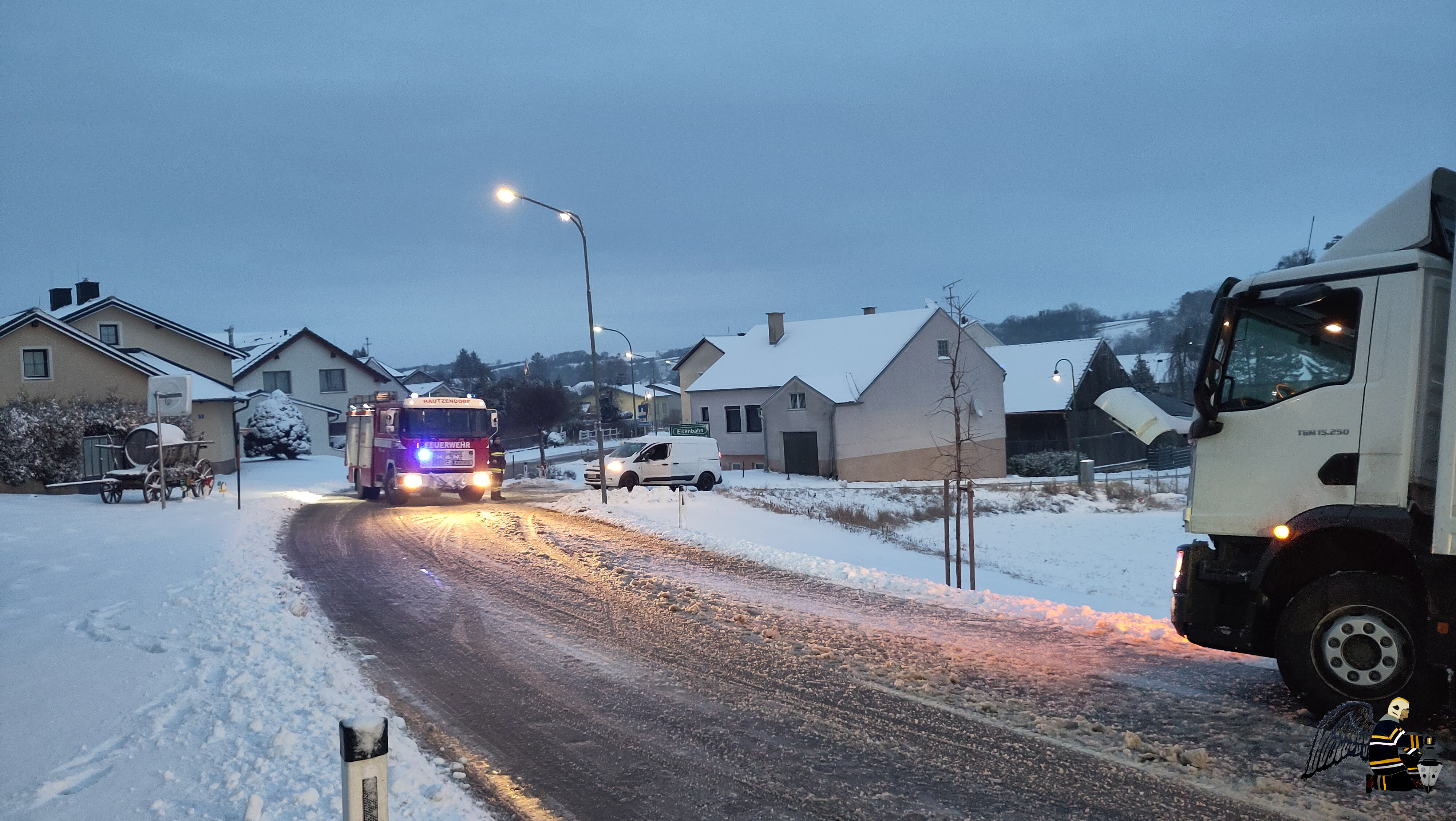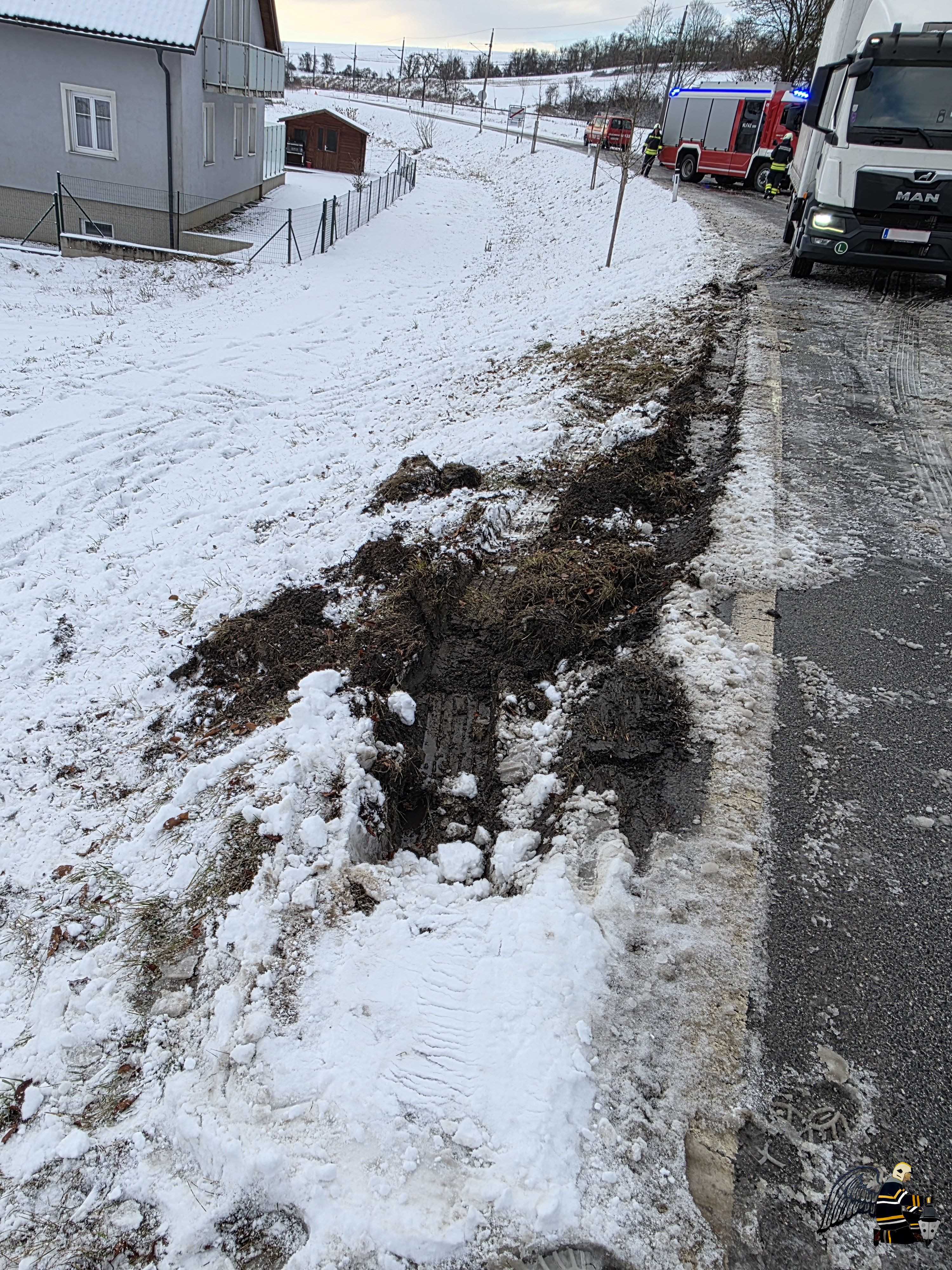 Bereits wenige Minuten nach der Alarmierung rückten KLF-W, TLF und MTF zur Einsatzstelle an der Ortsausfahrt Richtung Wolkersdorf aus. Vor Ort stellte sich heraus, dass ein Transportfahrzeug aufgrund der witterungsbedingten Straßenverhältnisse von der Fahrbahn abgekommen war und abzurutschen drohte.