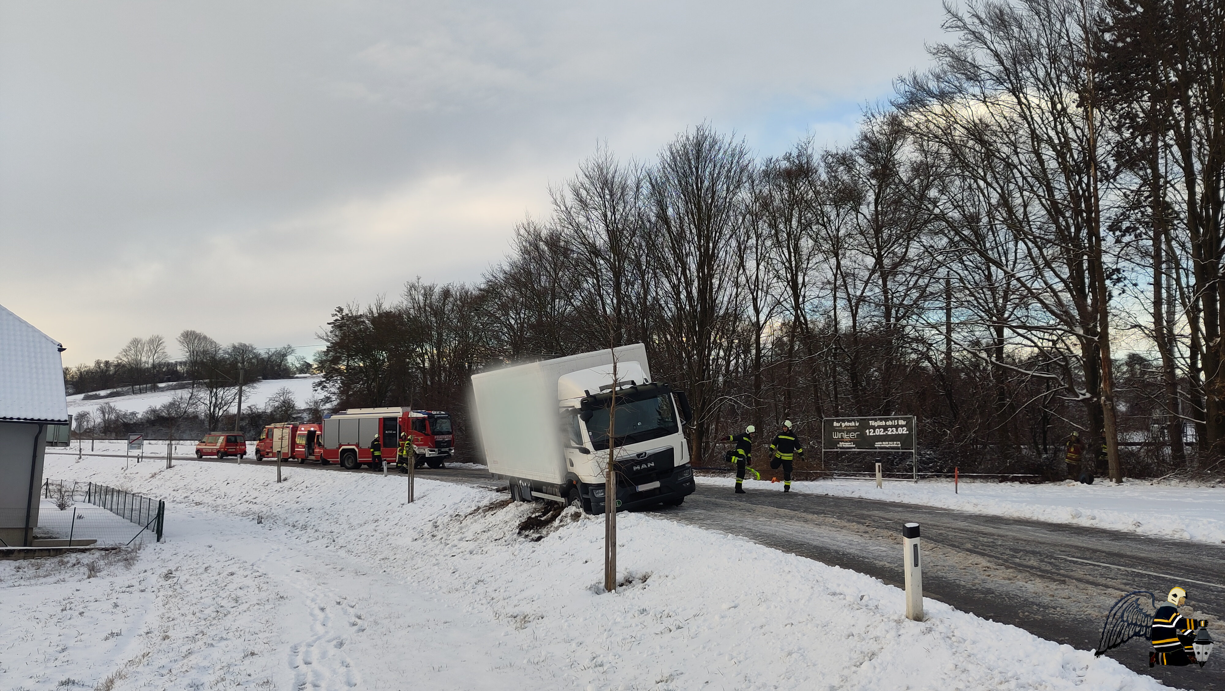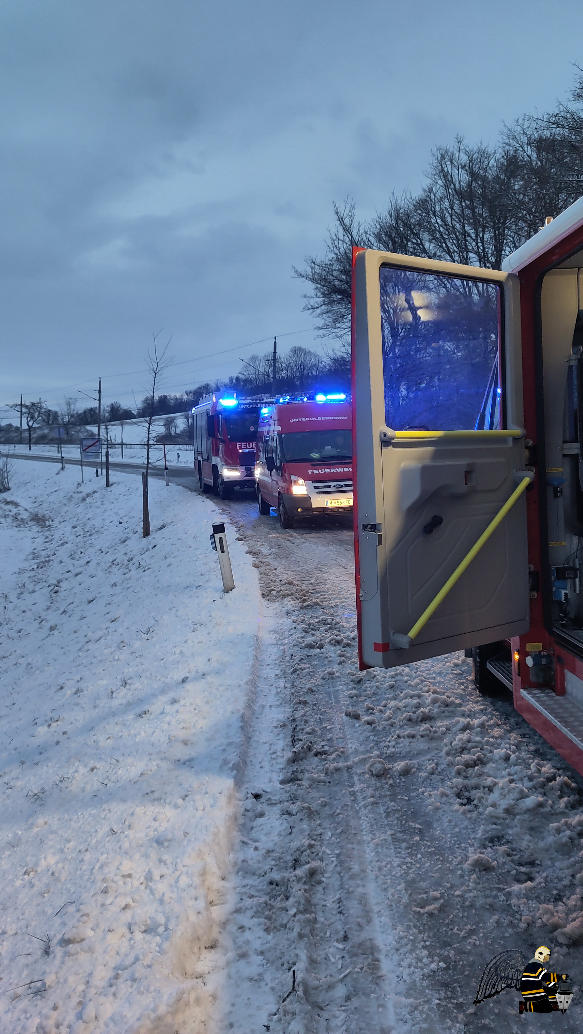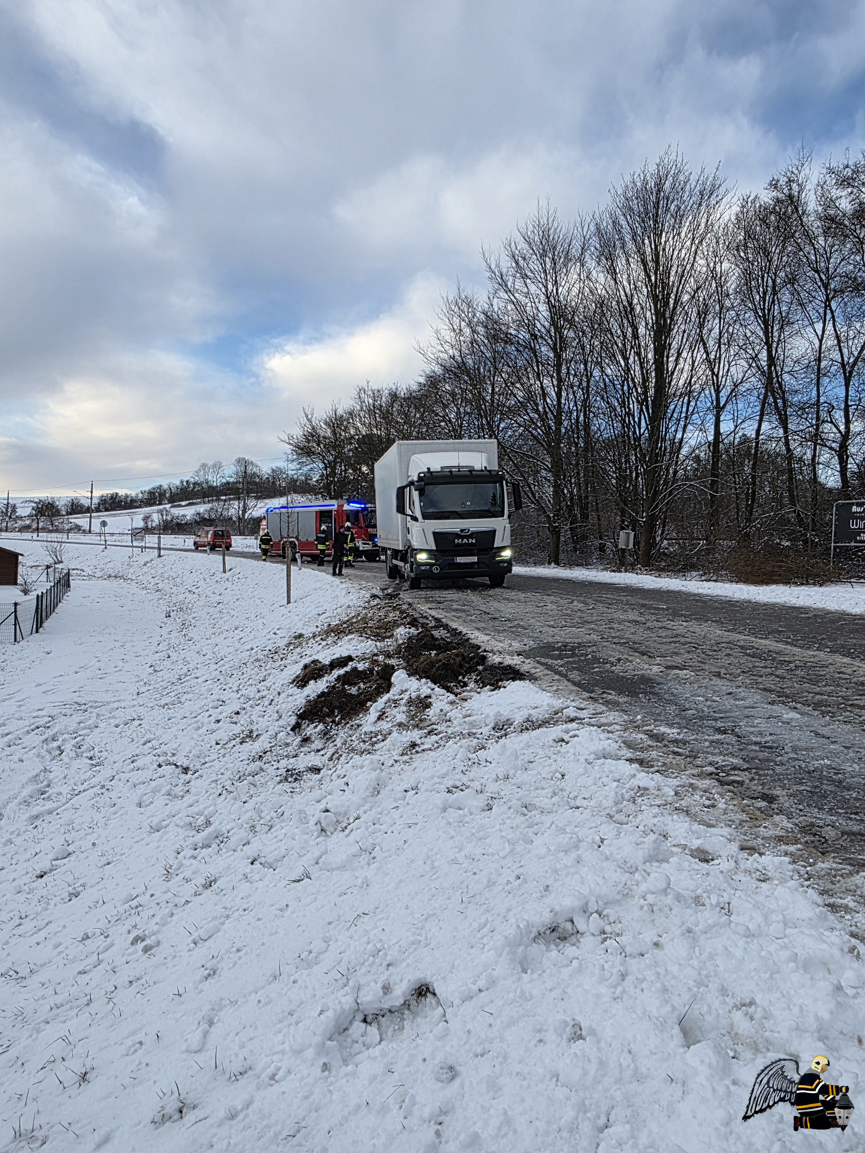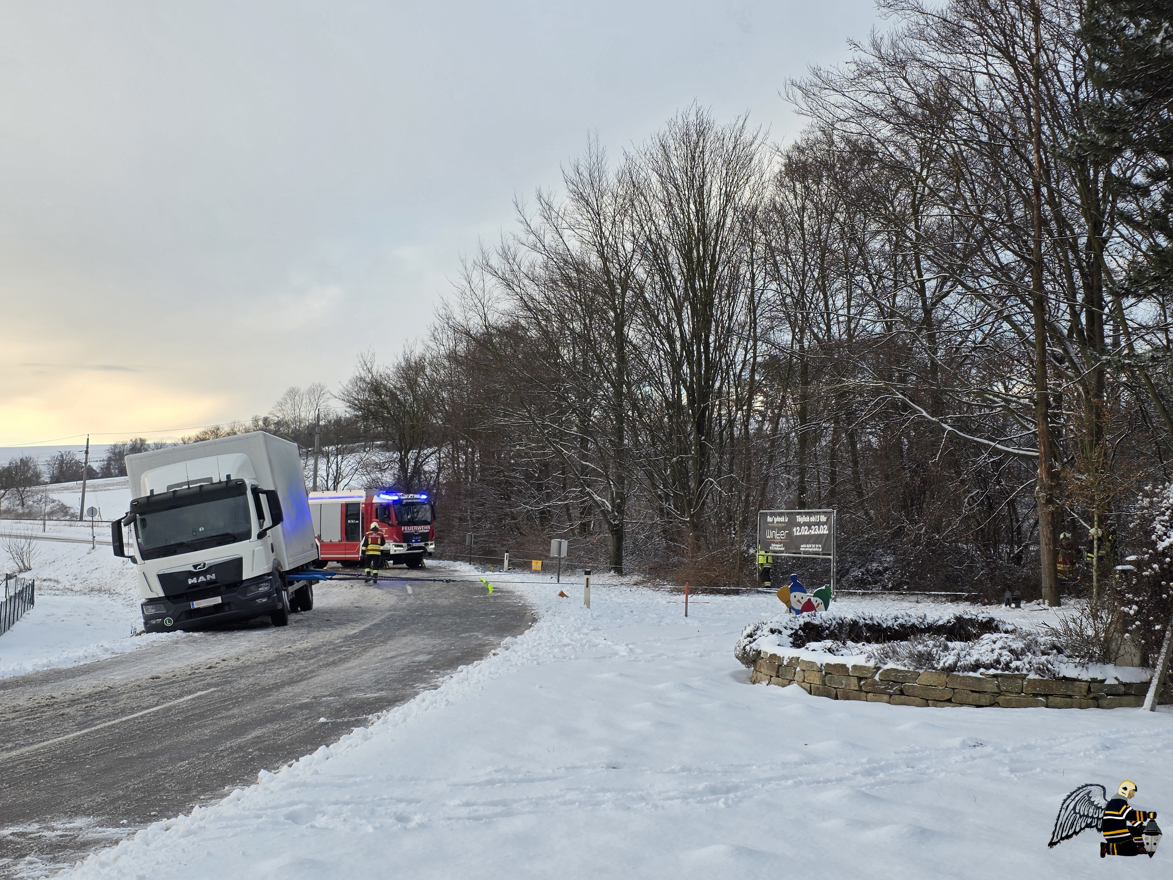 Bereits wenige Minuten nach der Alarmierung rückten KLF-W, TLF und MTF zur Einsatzstelle an der Ortsausfahrt Richtung Wolkersdorf aus. Vor Ort stellte sich heraus, dass ein Transportfahrzeug aufgrund der witterungsbedingten Straßenverhältnisse von der Fahrbahn abgekommen war und abzurutschen drohte.