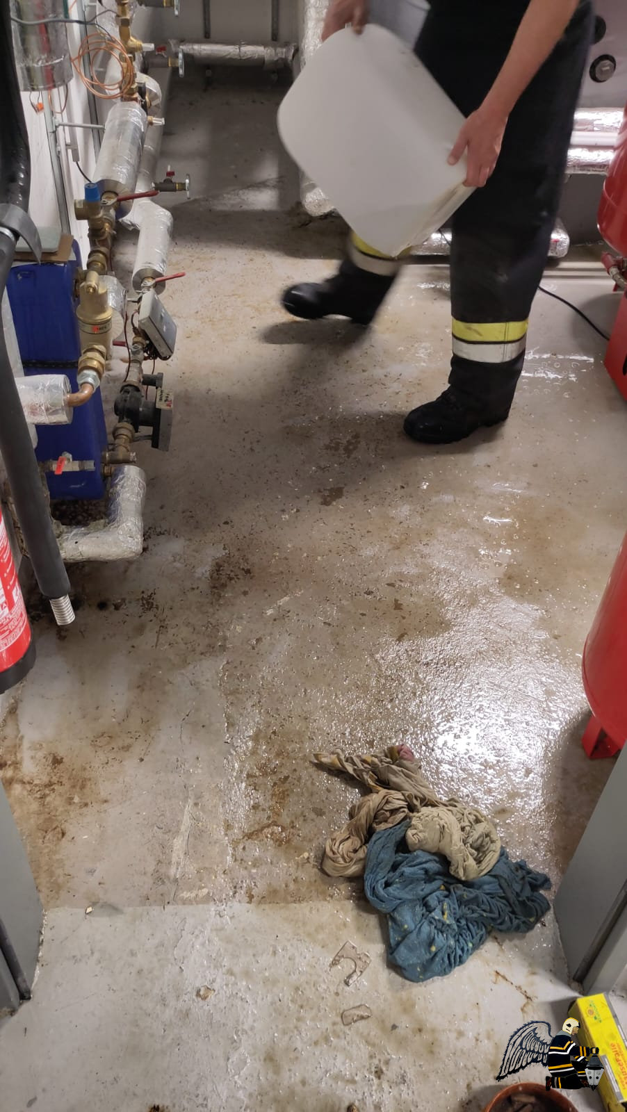 Unsere Kameraden leiteten umgehend die notwendigen Maßnahmen ein. Zunächst wurden die betroffenen Pumpen abgeschaltet und abgeklemmt sowie das entsprechende Ventil geschlossen. Anschließend wurde der Heizungsraum gründlich gereinigt und die ausgetretene Flüssigkeit fachgerecht gebunden und gesichert.