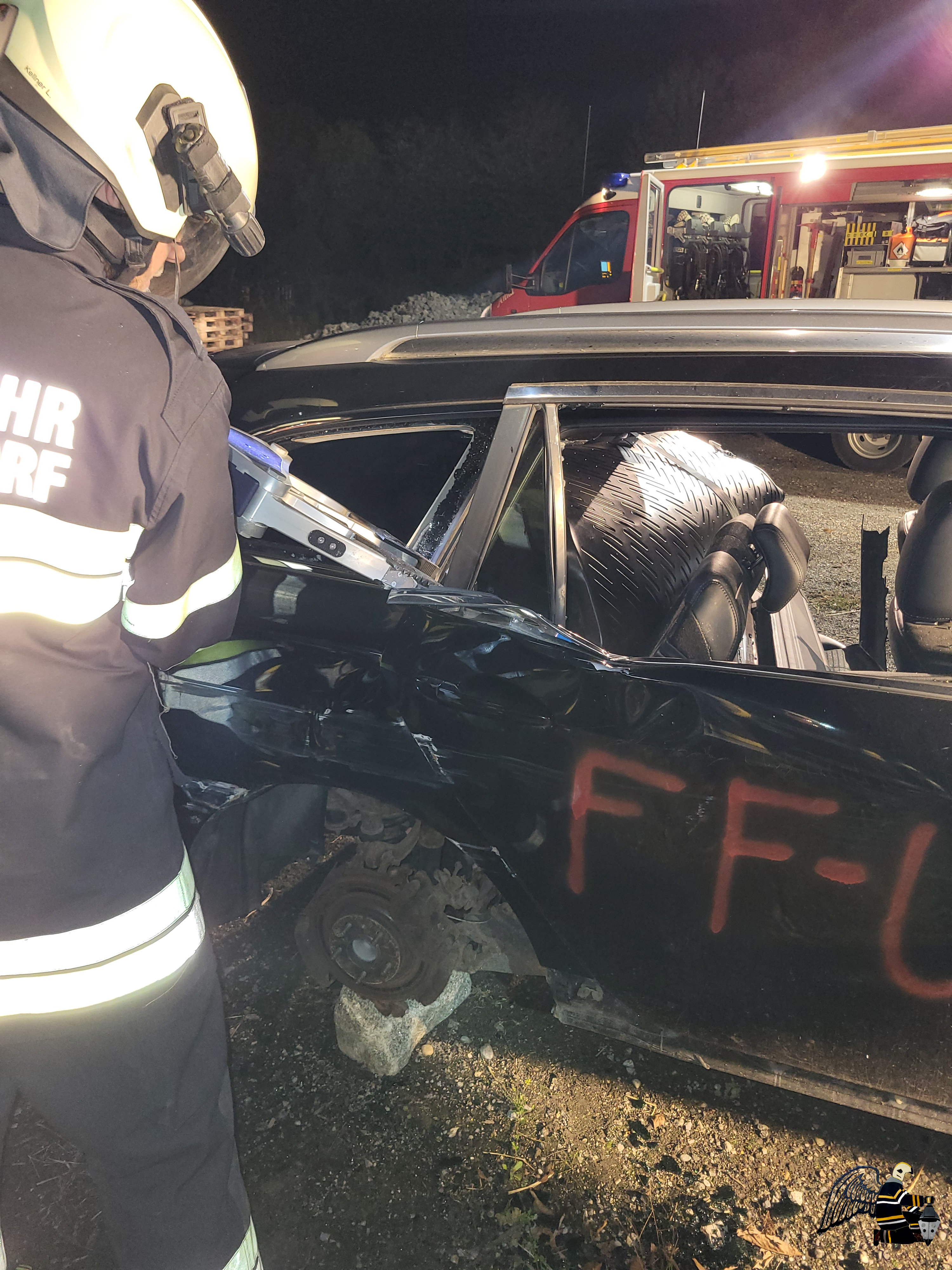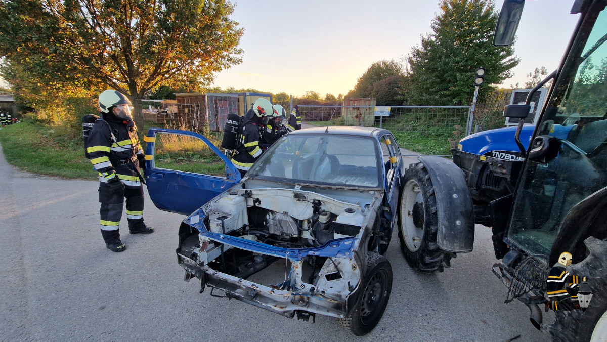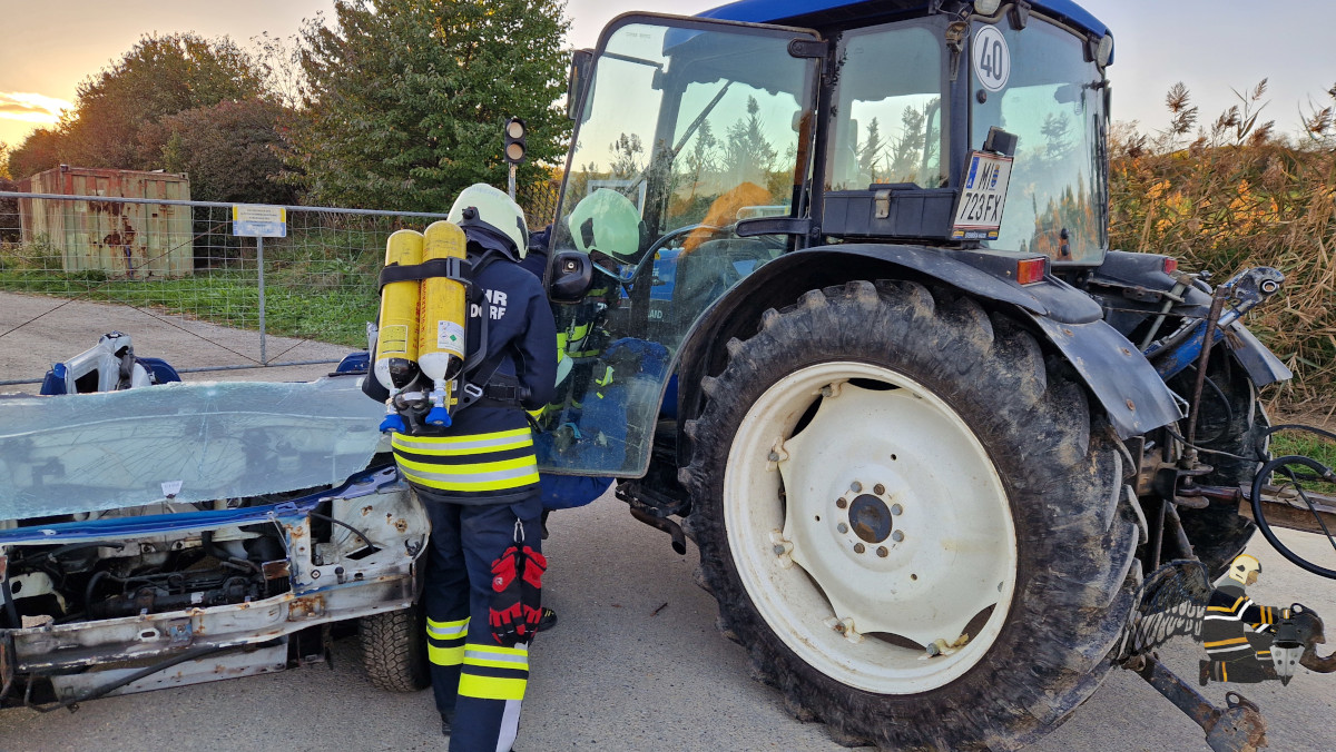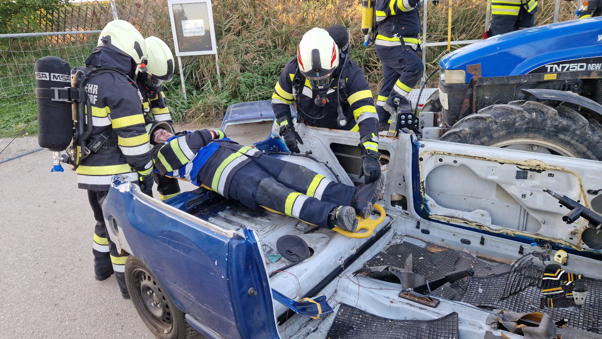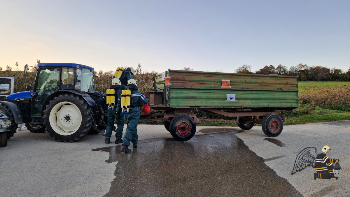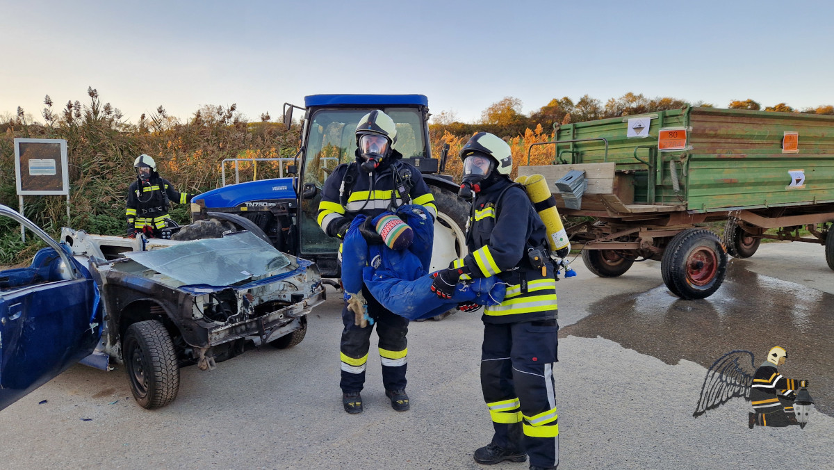 Angenommen wurde ein Verkehrsunfall zwischen einem PKW und einem Traktor mit Anhänger. In beiden Fahrzeugen befanden sich eingeklemmte Personen, was eine schnelle und koordinierte Rettung erforderlich machte. Die besondere Herausforderung: Auf dem Anhänger des Traktors war eine Chemikalie geladen, die den Einsatz erheblich erschwerte.