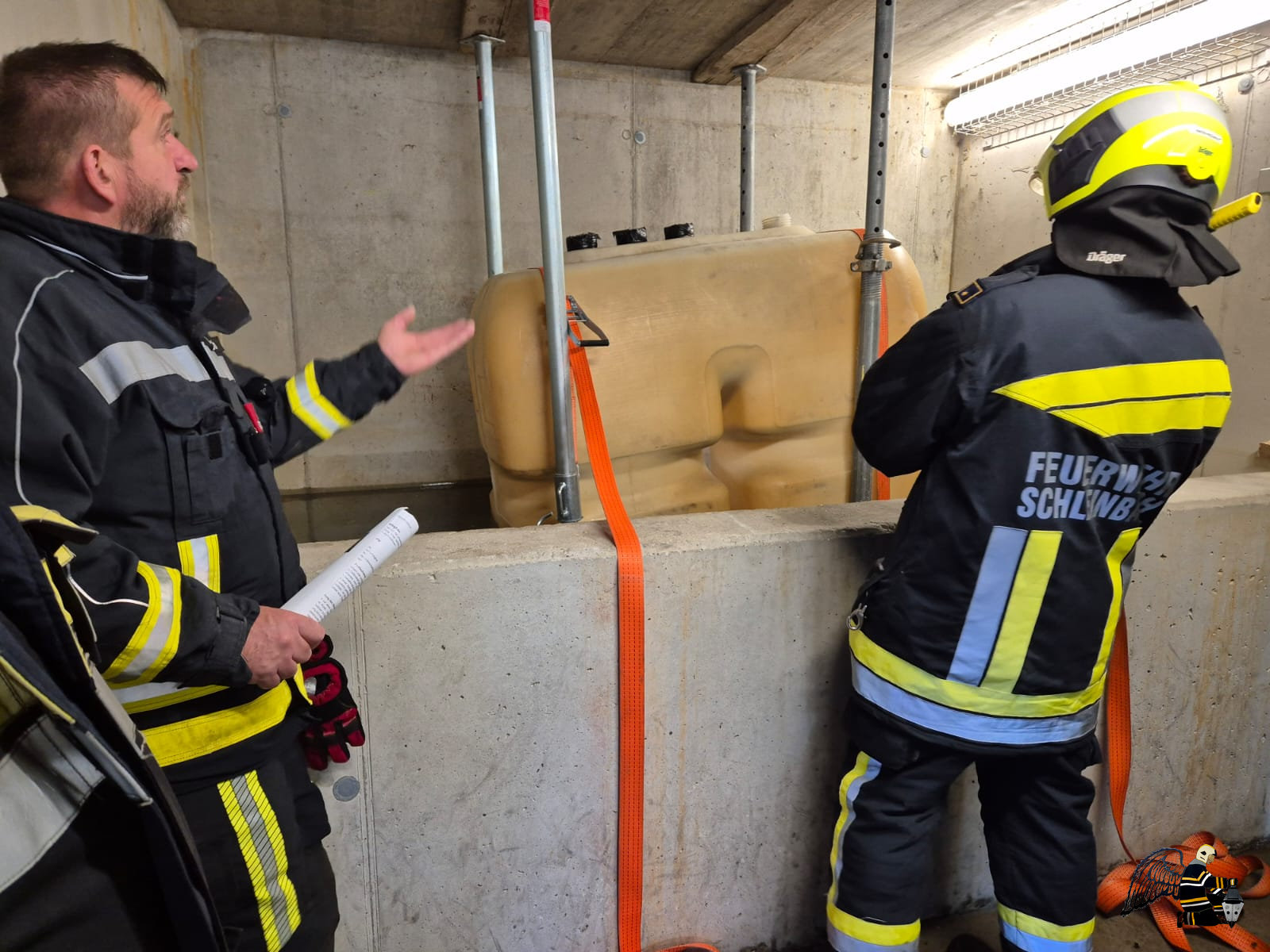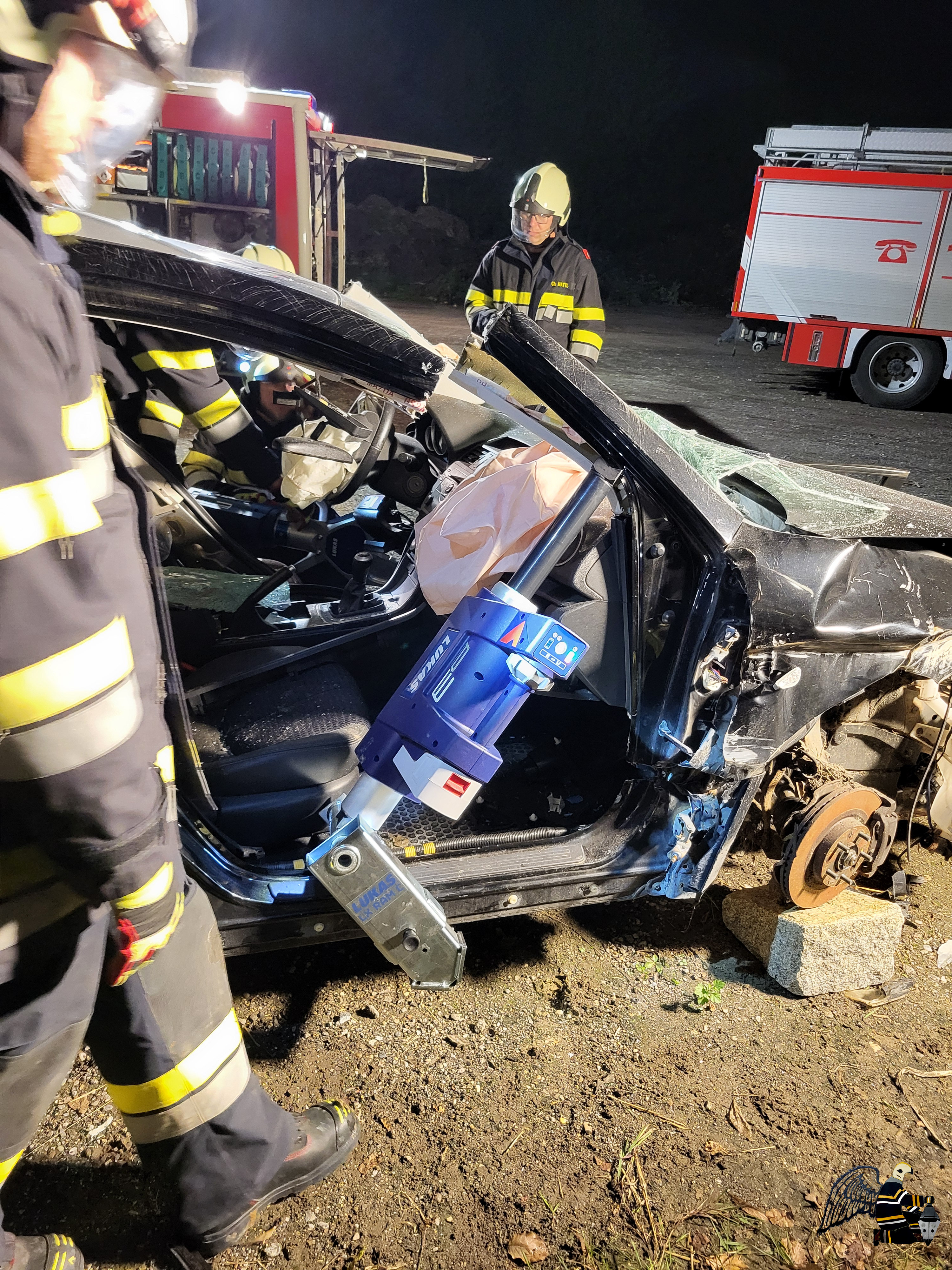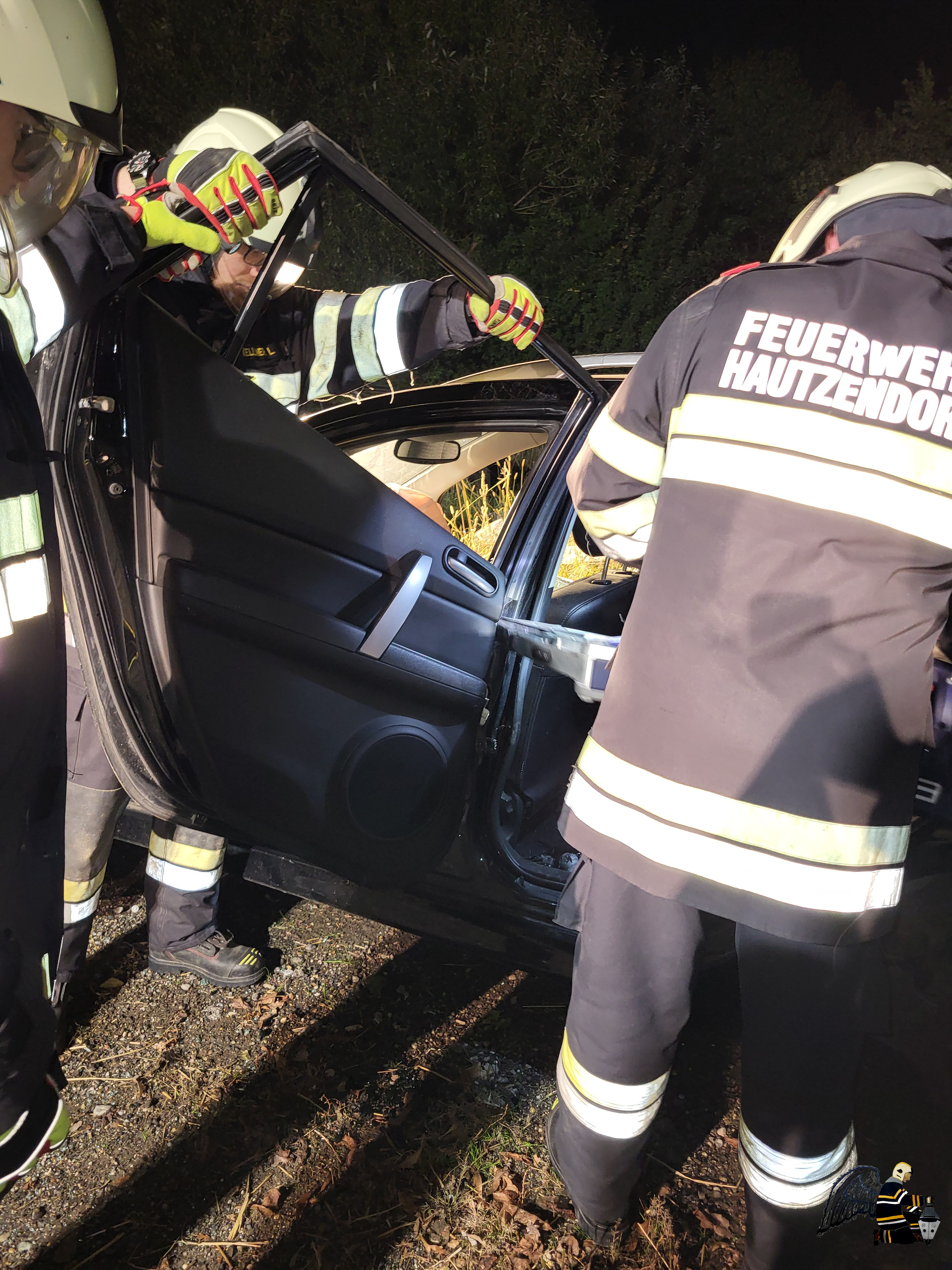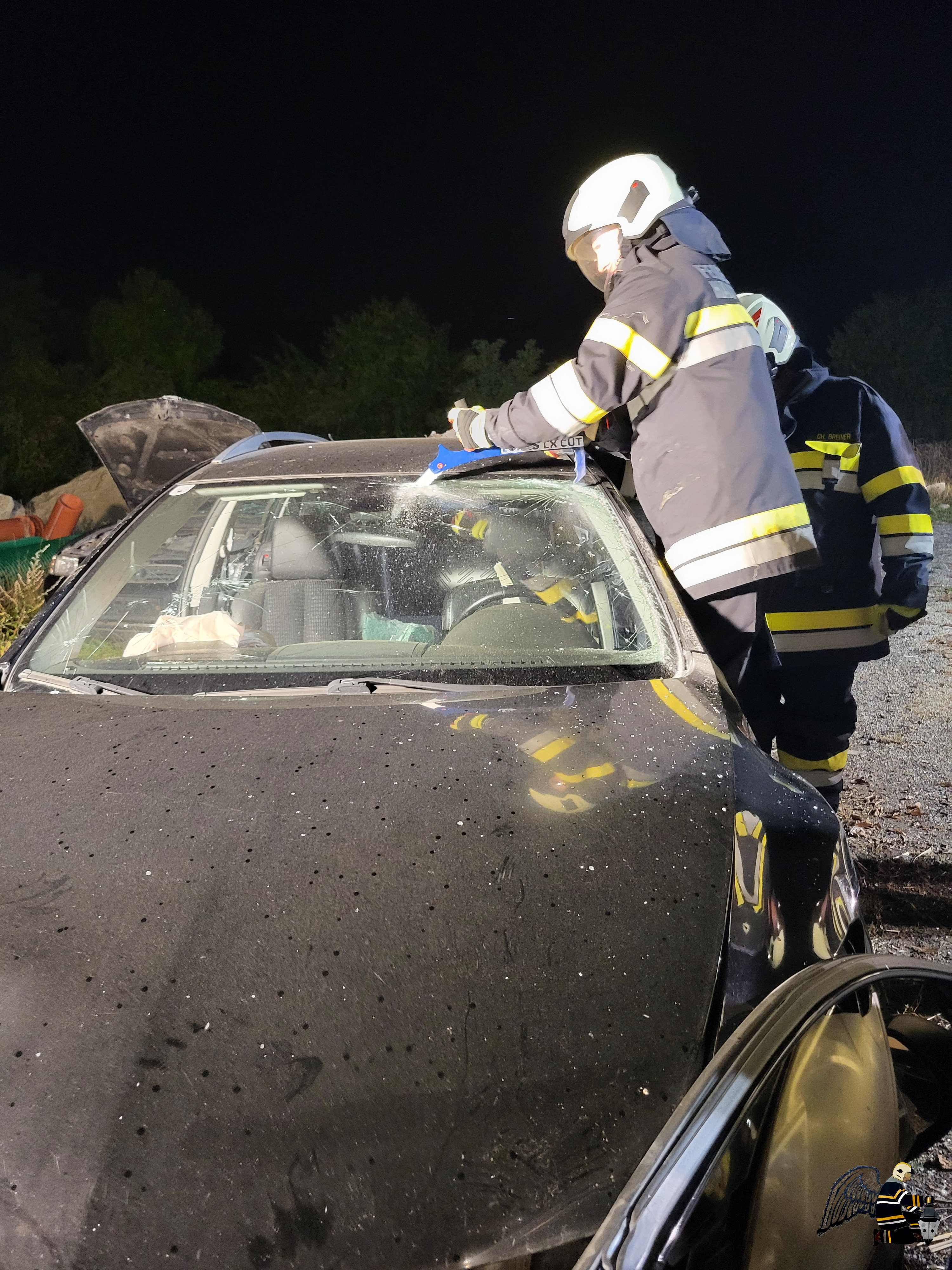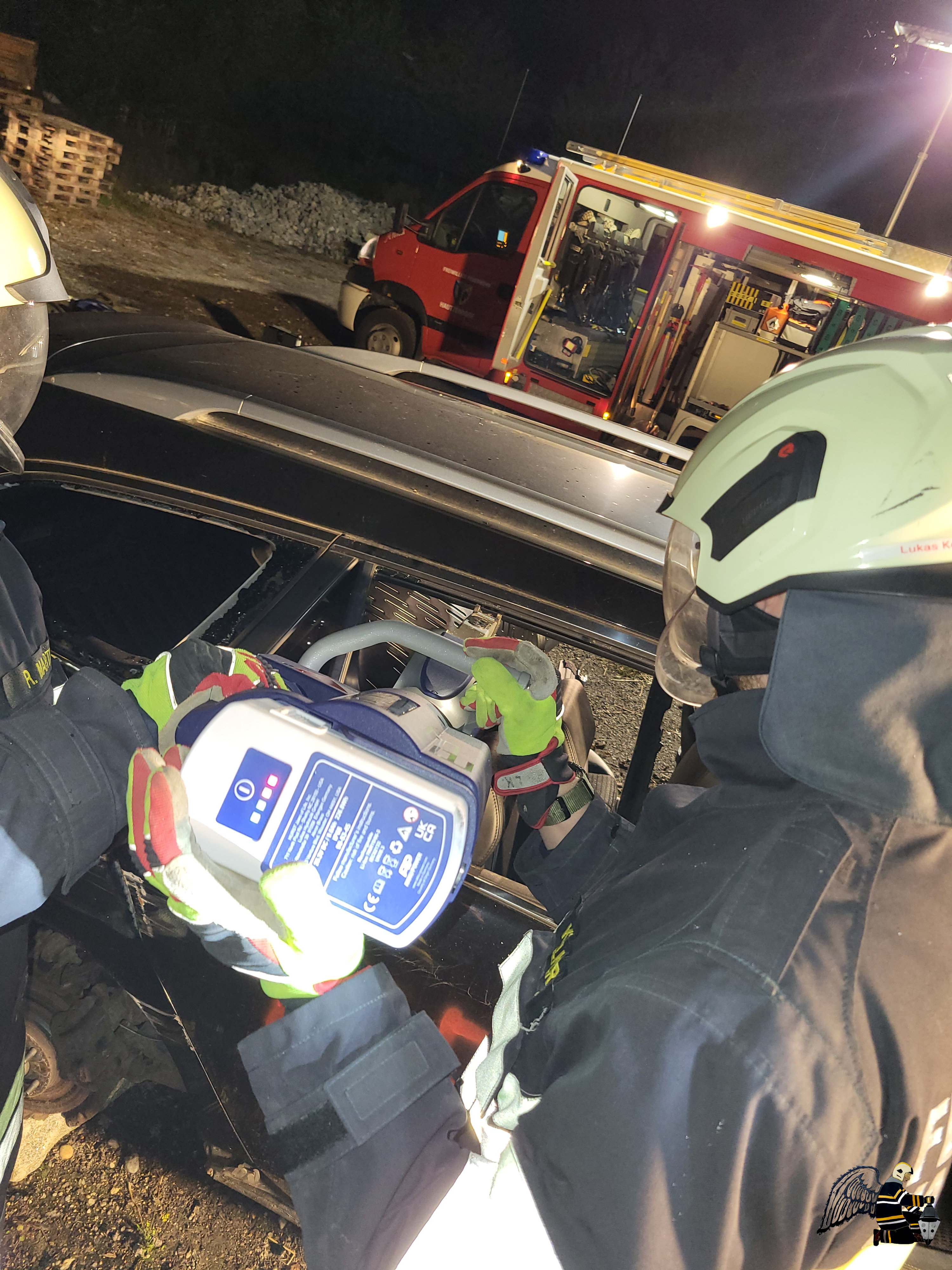 Angenommen wurde ein Verkehrsunfall zwischen einem PKW und einem Traktor mit Anhänger. In beiden Fahrzeugen befanden sich eingeklemmte Personen, was eine schnelle und koordinierte Rettung erforderlich machte. Die besondere Herausforderung: Auf dem Anhänger des Traktors war eine Chemikalie geladen, die den Einsatz erheblich erschwerte.