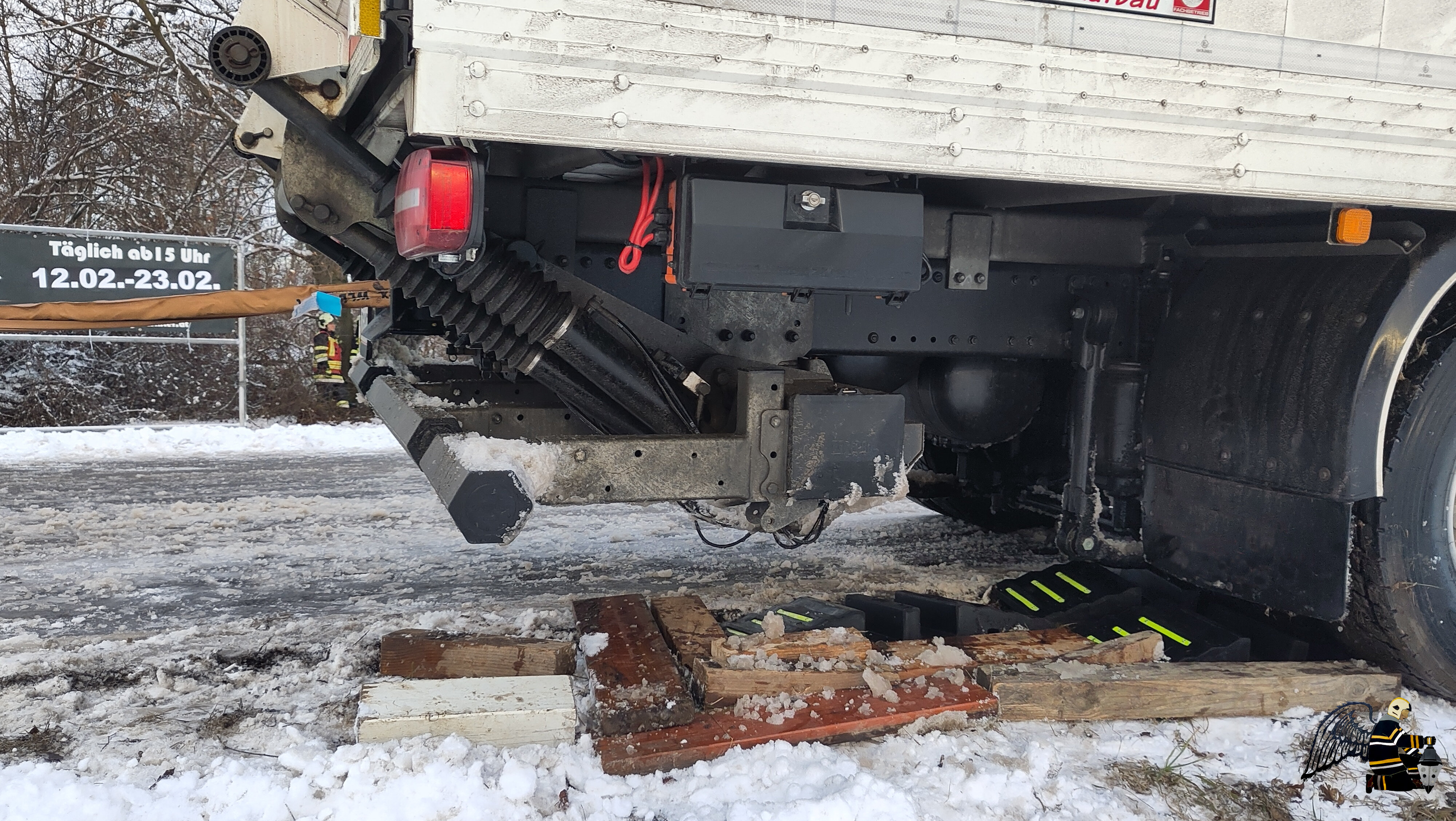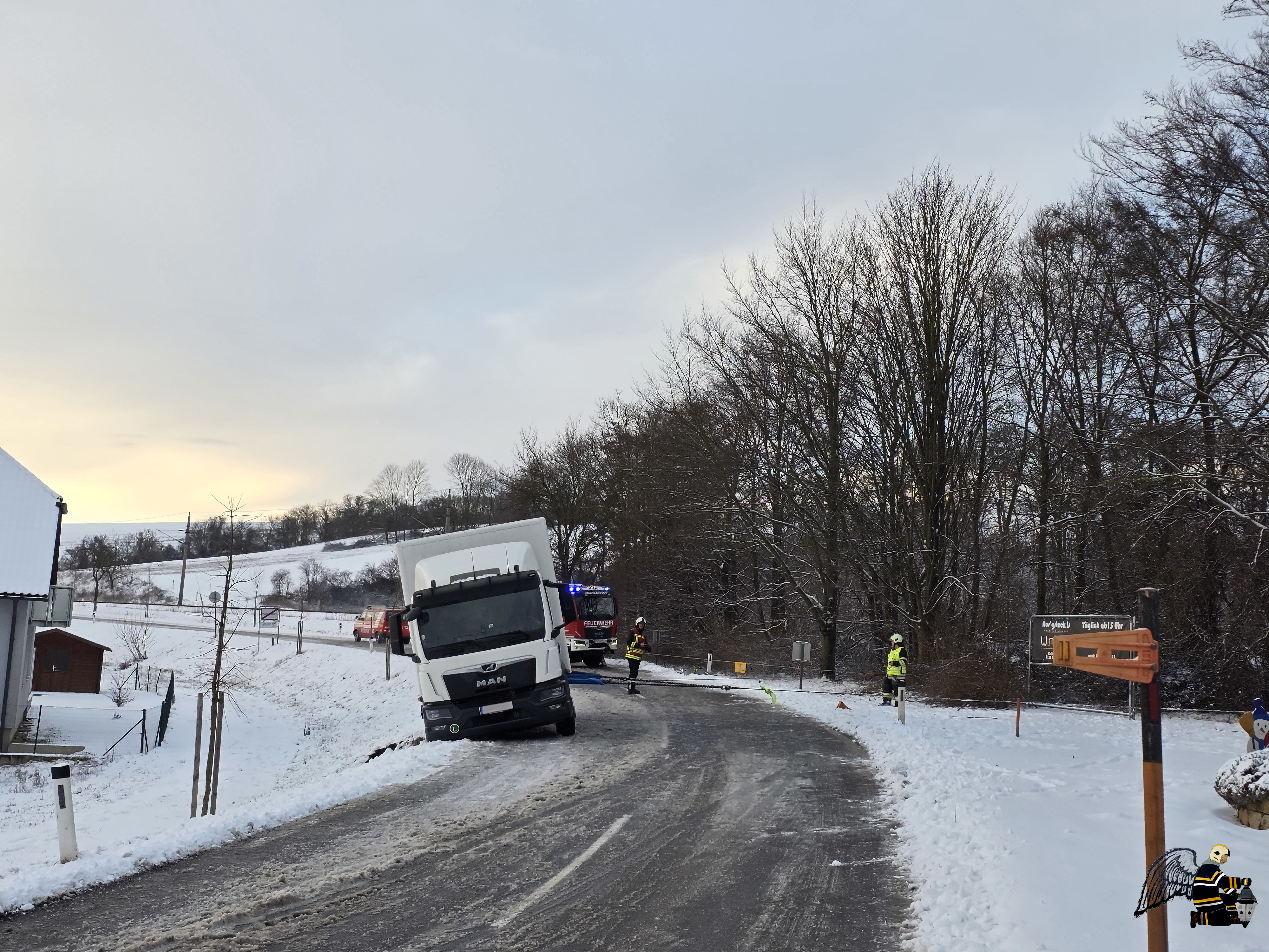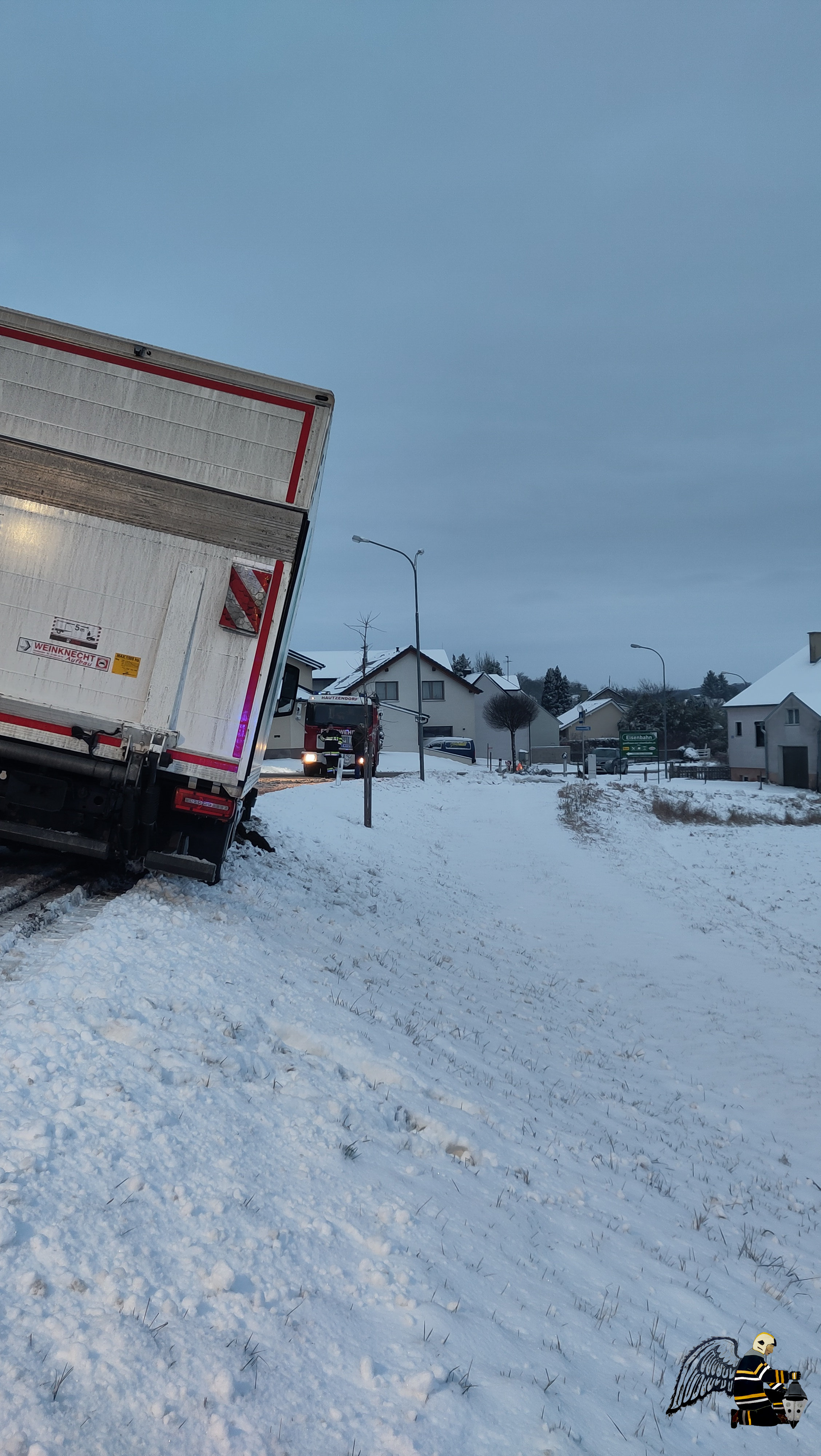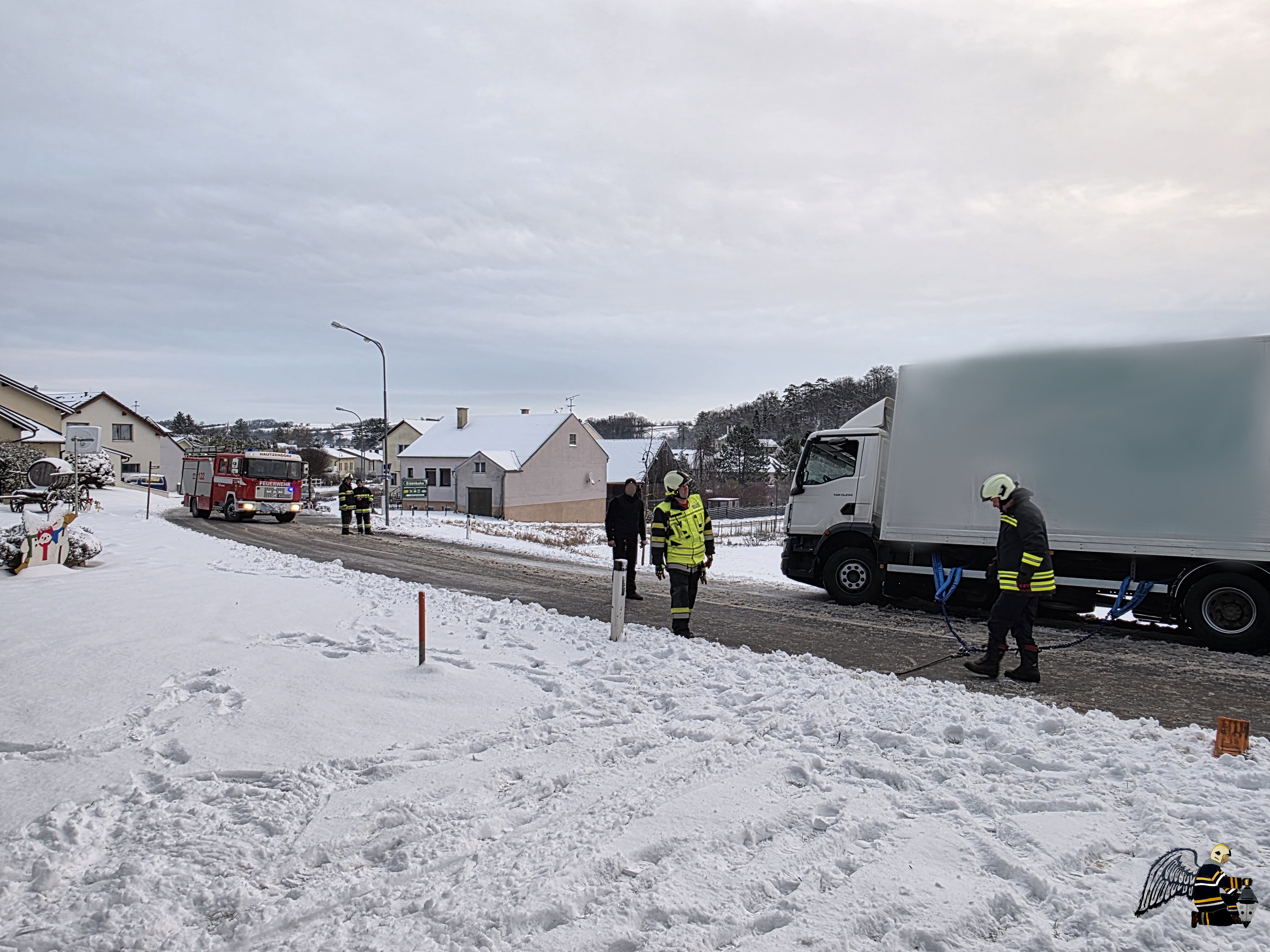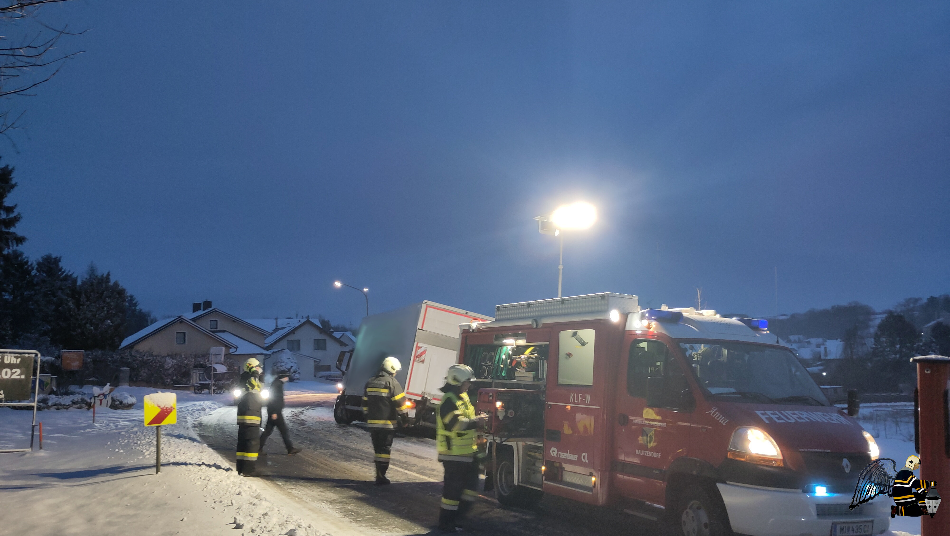 Bereits wenige Minuten nach der Alarmierung rückten KLF-W, TLF und MTF zur Einsatzstelle an der Ortsausfahrt Richtung Wolkersdorf aus. Vor Ort stellte sich heraus, dass ein Transportfahrzeug aufgrund der witterungsbedingten Straßenverhältnisse von der Fahrbahn abgekommen war und abzurutschen drohte.
