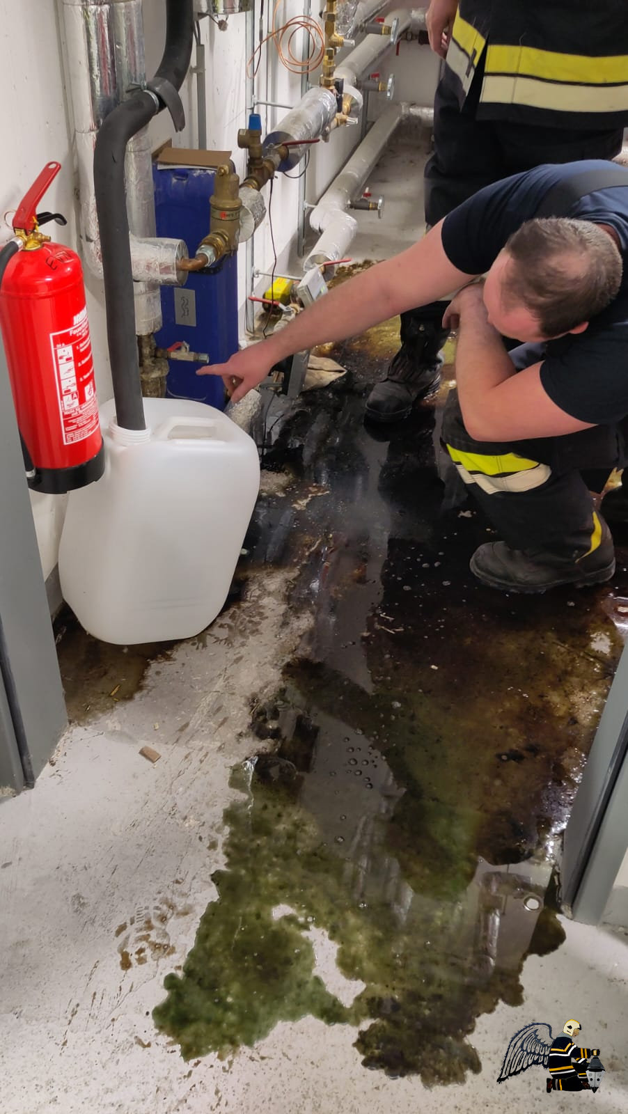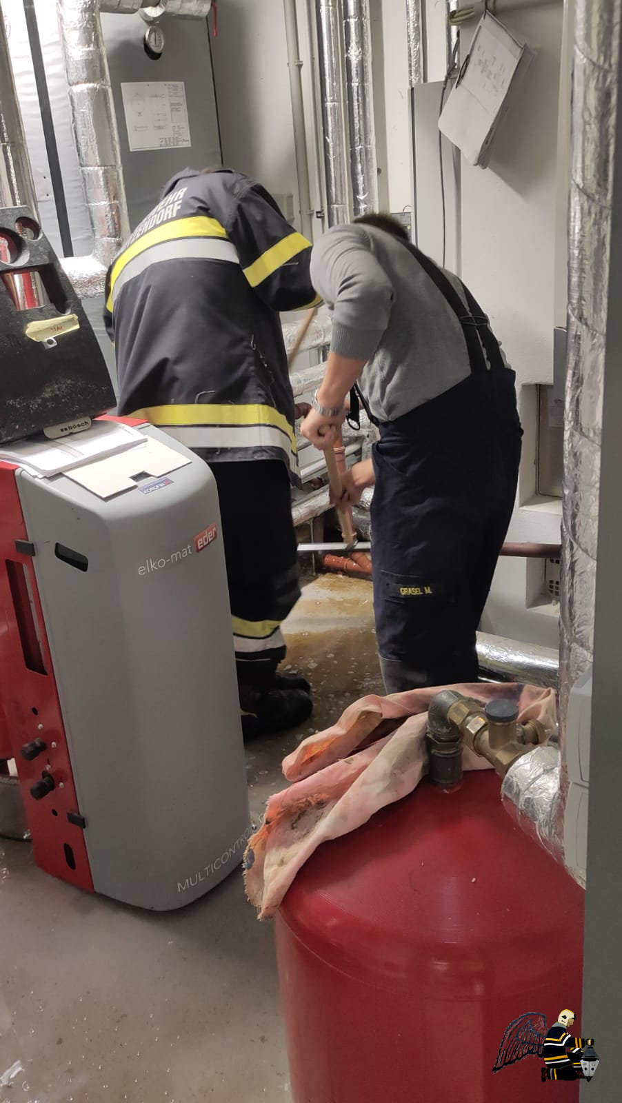 Unsere Kameraden leiteten umgehend die notwendigen Maßnahmen ein. Zunächst wurden die betroffenen Pumpen abgeschaltet und abgeklemmt sowie das entsprechende Ventil geschlossen. Anschließend wurde der Heizungsraum gründlich gereinigt und die ausgetretene Flüssigkeit fachgerecht gebunden und gesichert.